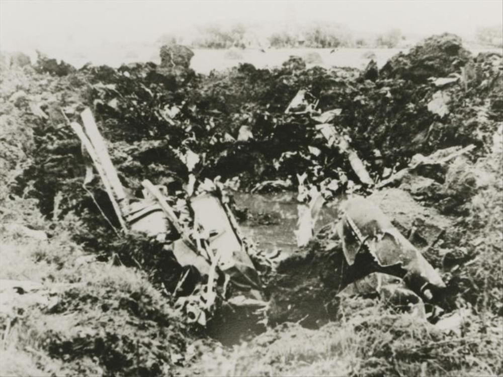 Foto krater in de grond emt wrakstukken (neergestort...