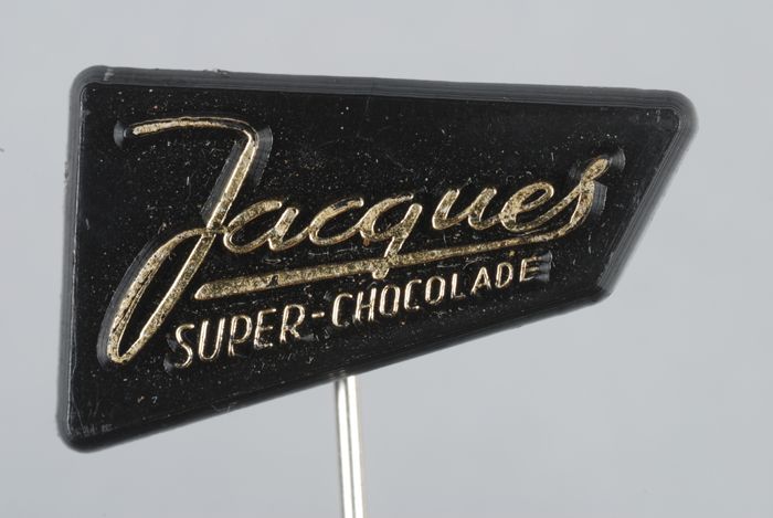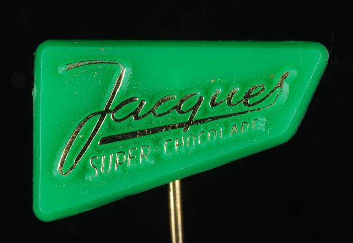 Groene reclamespeld, met in goud "Jacques, super-cho...