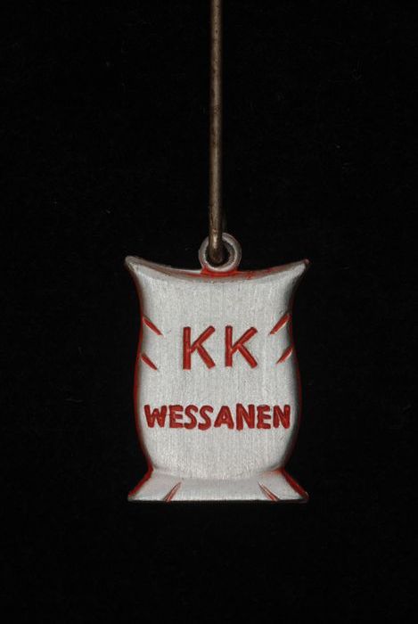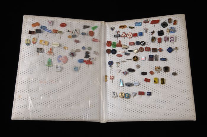 Witte rechthoekige reclamespeld, met in bruin en roo...
