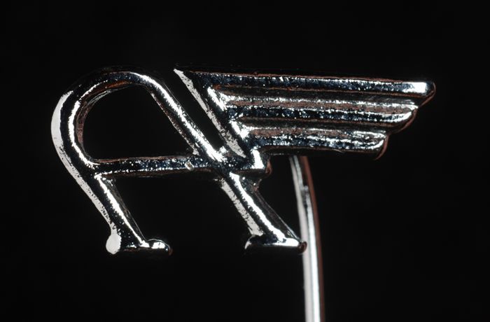 Witte reclamespeld, met blauw wapenschild waarin "aD"