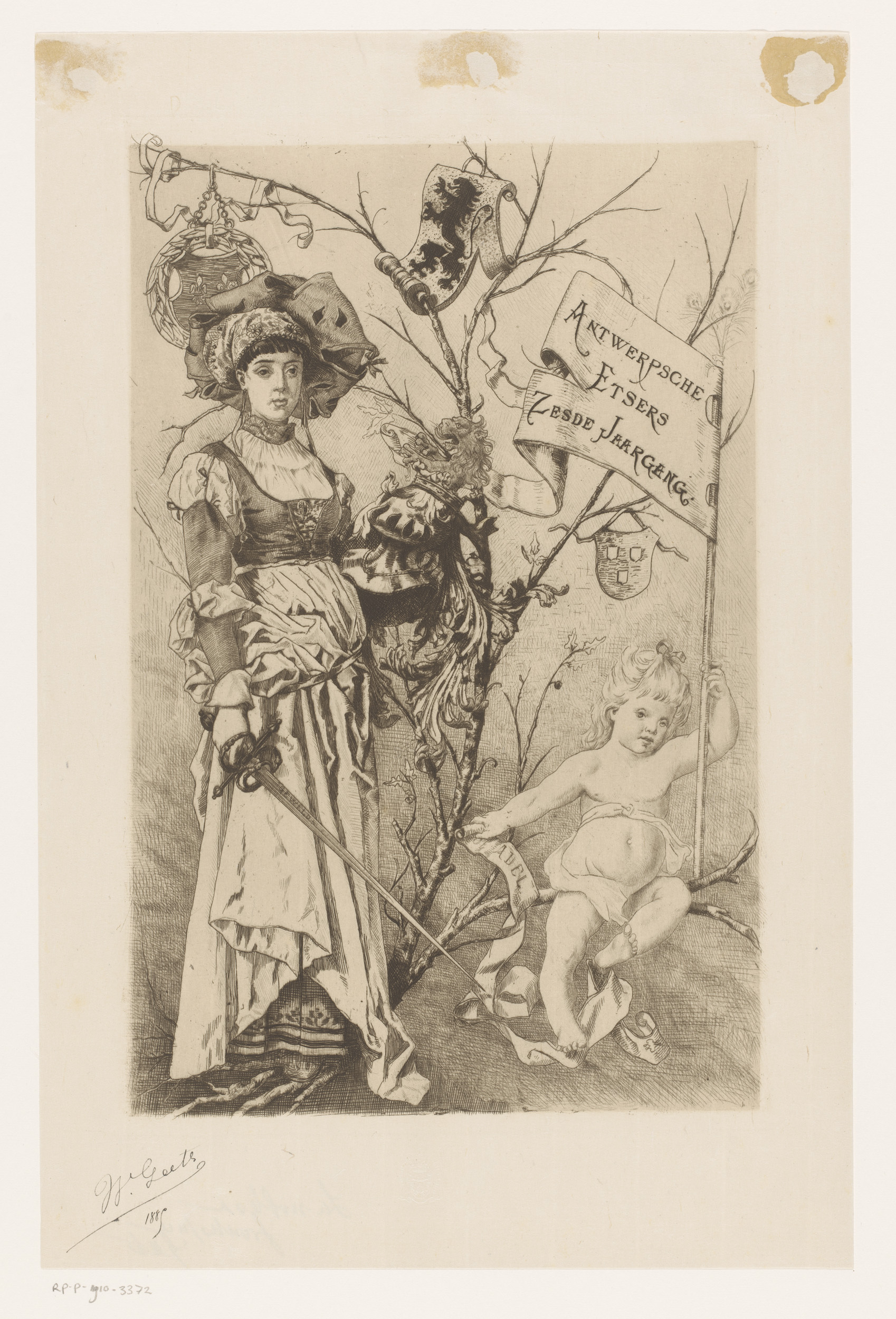 Jonge vrouw met helm en zwaard bij een tak met wapen...