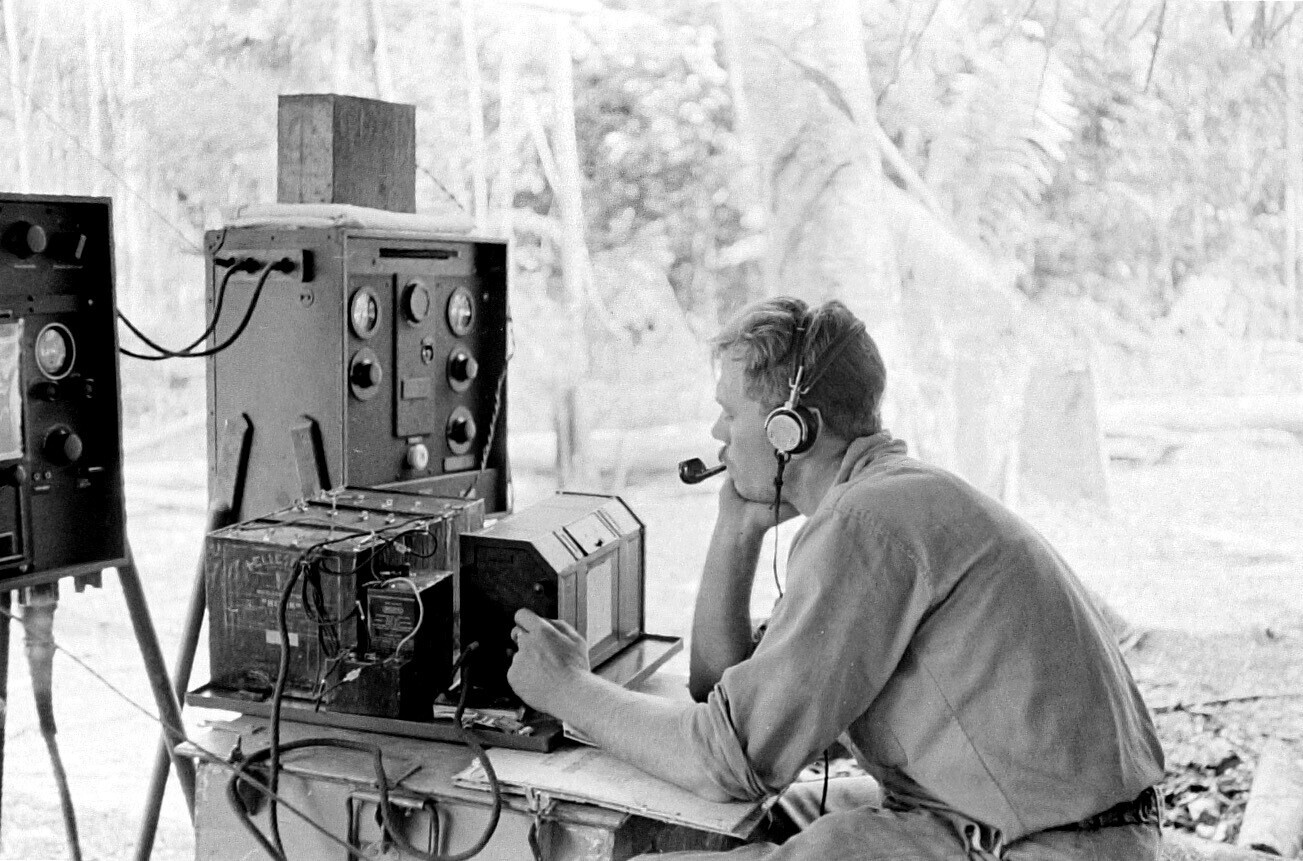 Korporaal Meuldijk voor de radio in het hoofdmagazijn.