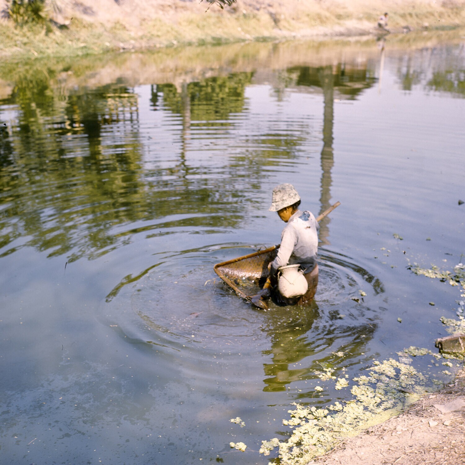 Noord Thailand Vrouw vissend met schepmand. In de po...
