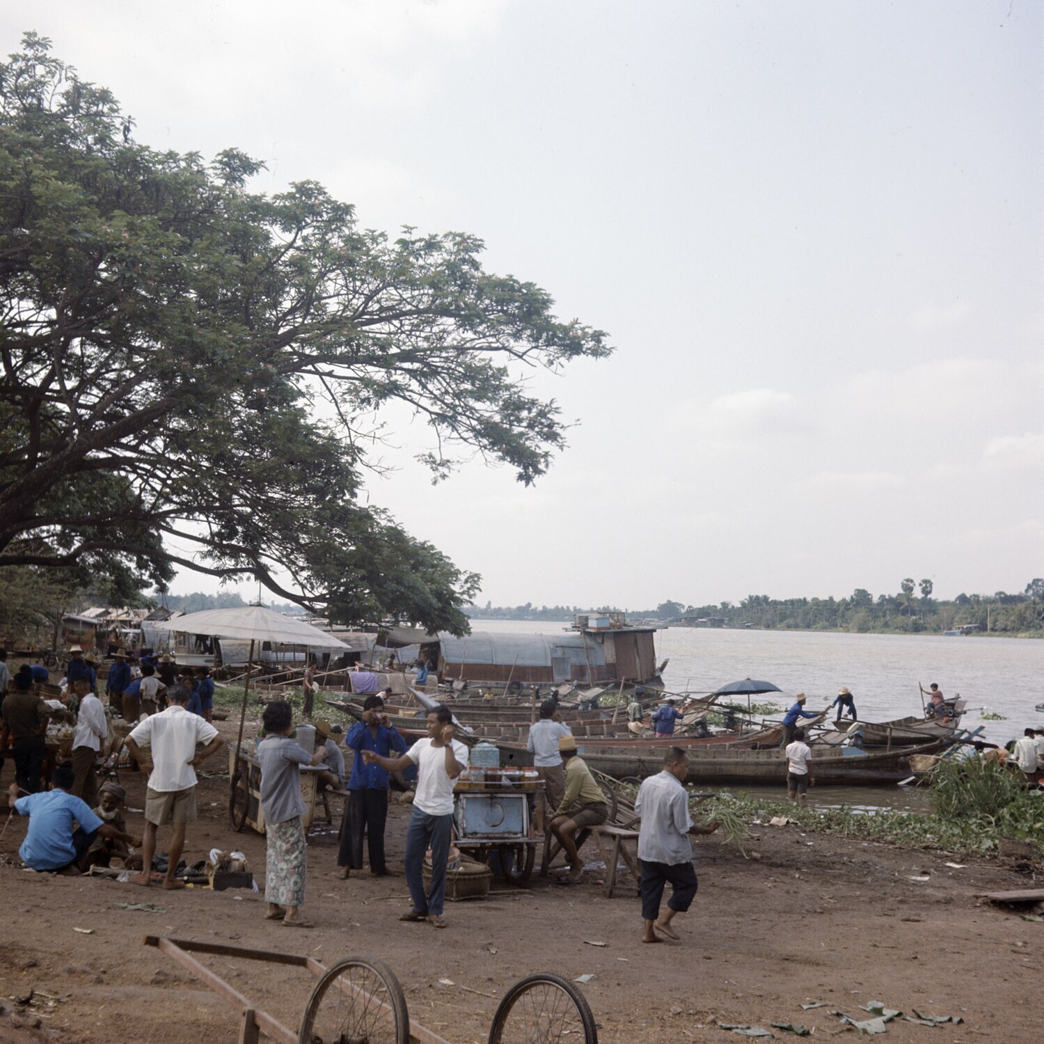 Boten van marktgangers aan de oever van de Chao Phya...