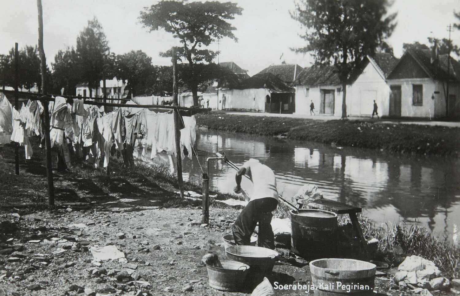 Het wassen en drogen van kleding bij de Kali Pegiria...