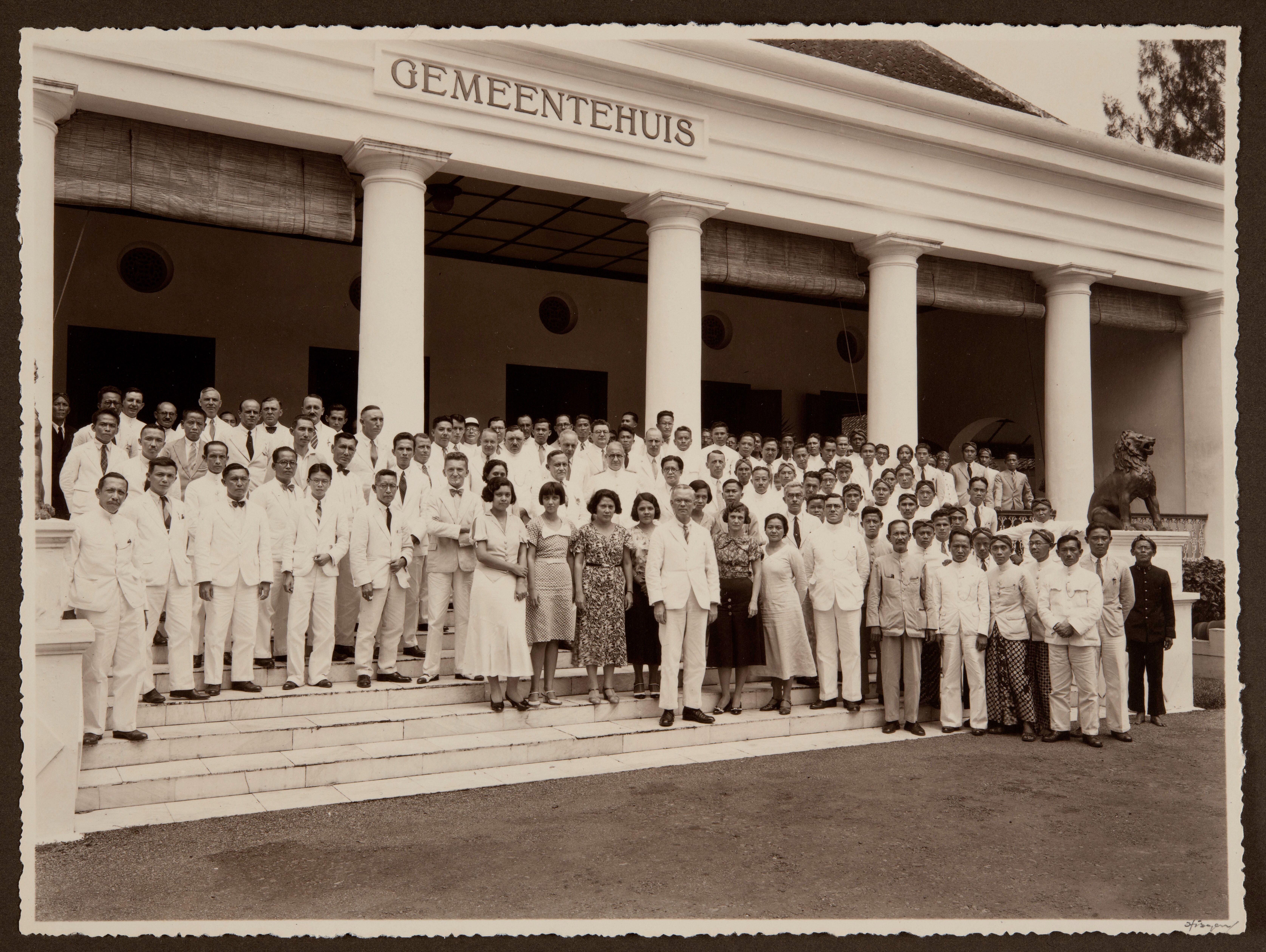 Groepsportret bij een feestelijke aangelegenheid op ...