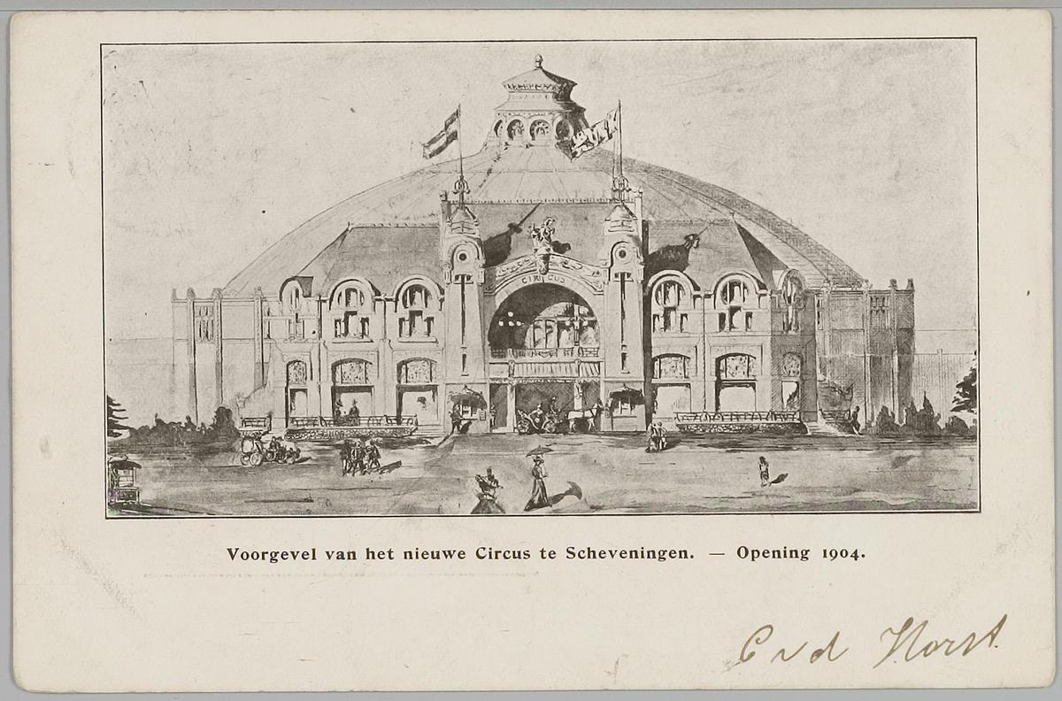 Voorgevel van het Circus te Scheveningen. Opening 1904