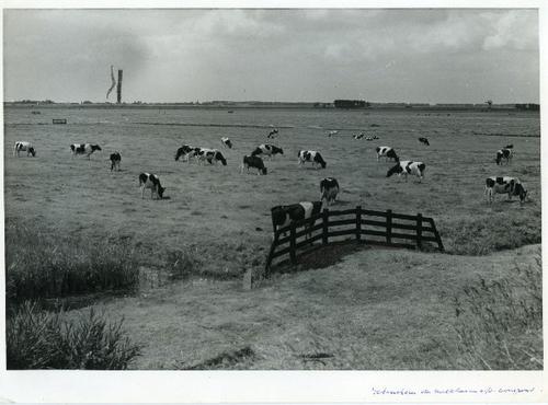 Foto in zwart-wit van een poldervaart met weilanden ...