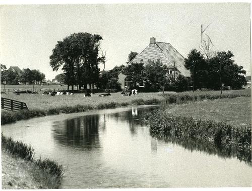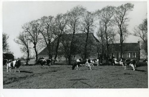 Foto in zwart-wit van een kop-rompboerderij met koei...