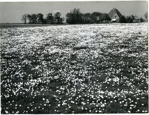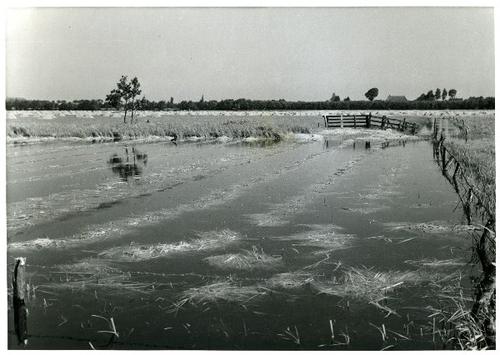 Foto in zwart-wit van ondergelopen hooiland door J.D...