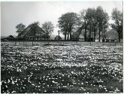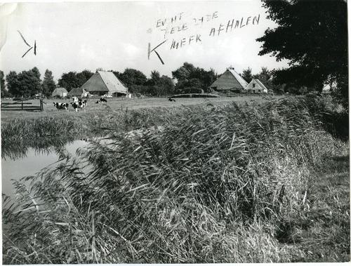 Foto in zwart-wit van twee boerderijen met bijgebouw...