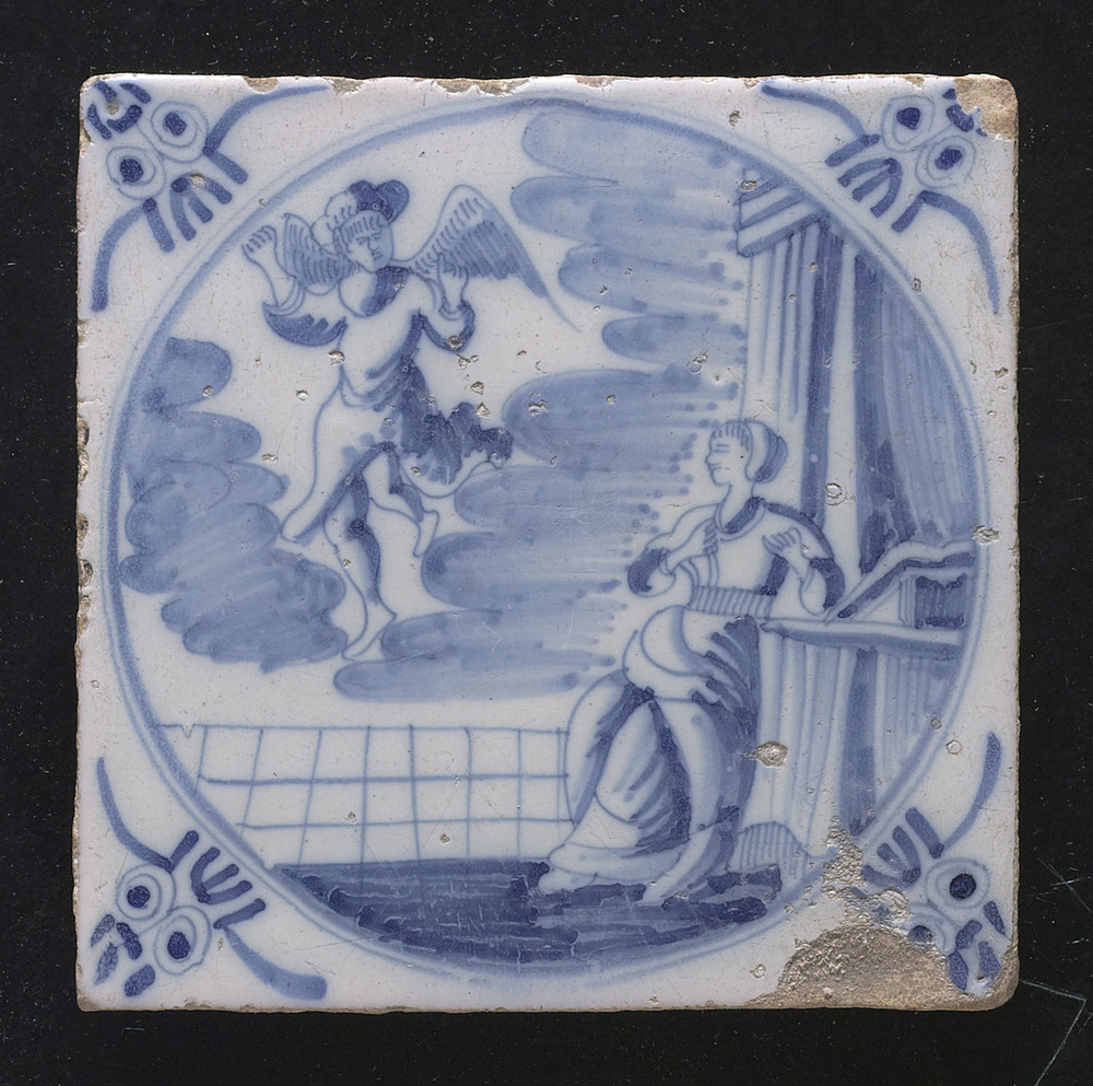 Tegel van keramiek met tinglazuur, voorstellende: De...