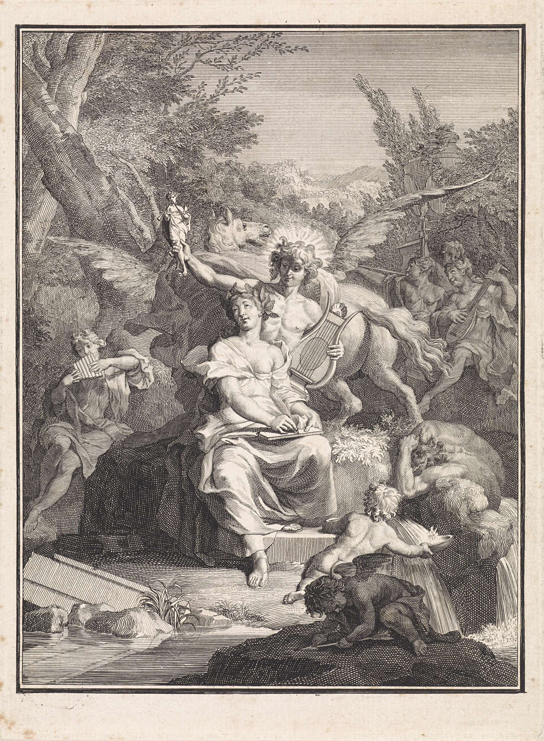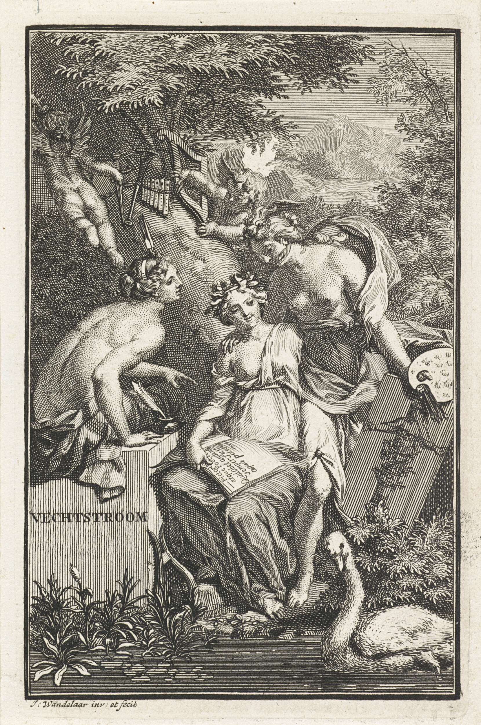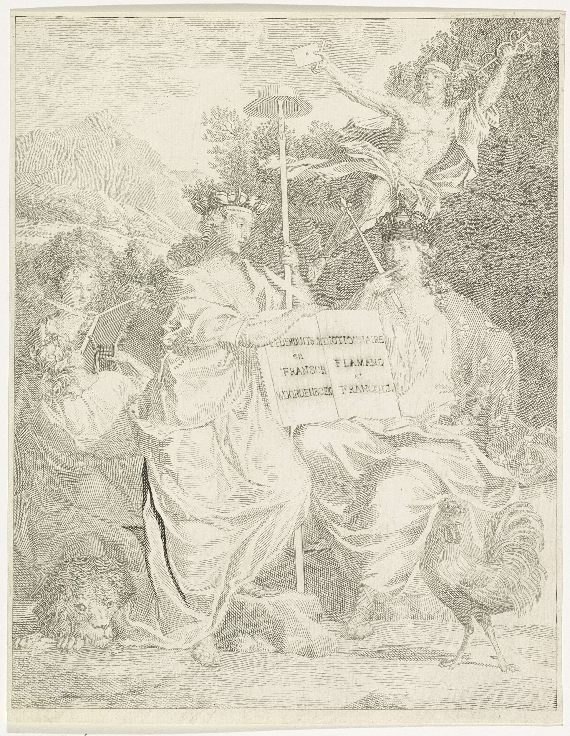 Allegorische vrouwfiguur en Minerva in een landschap