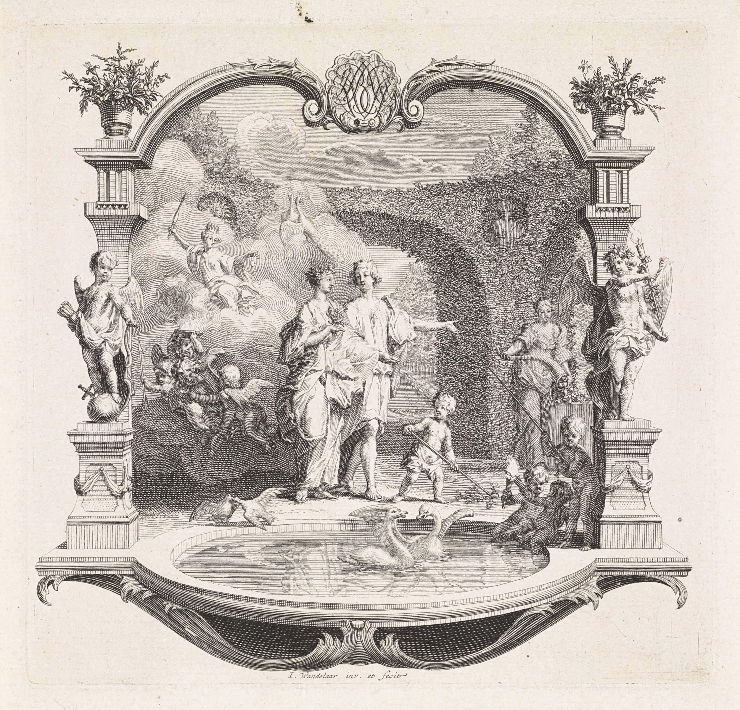 Vier zwevende putti met guirlandes