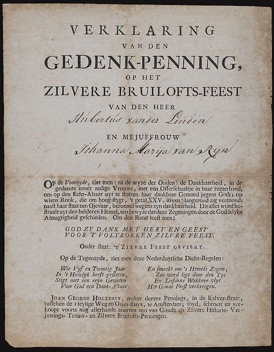 Gedrukte "Verklaring van den gedenk-penning, op het ...