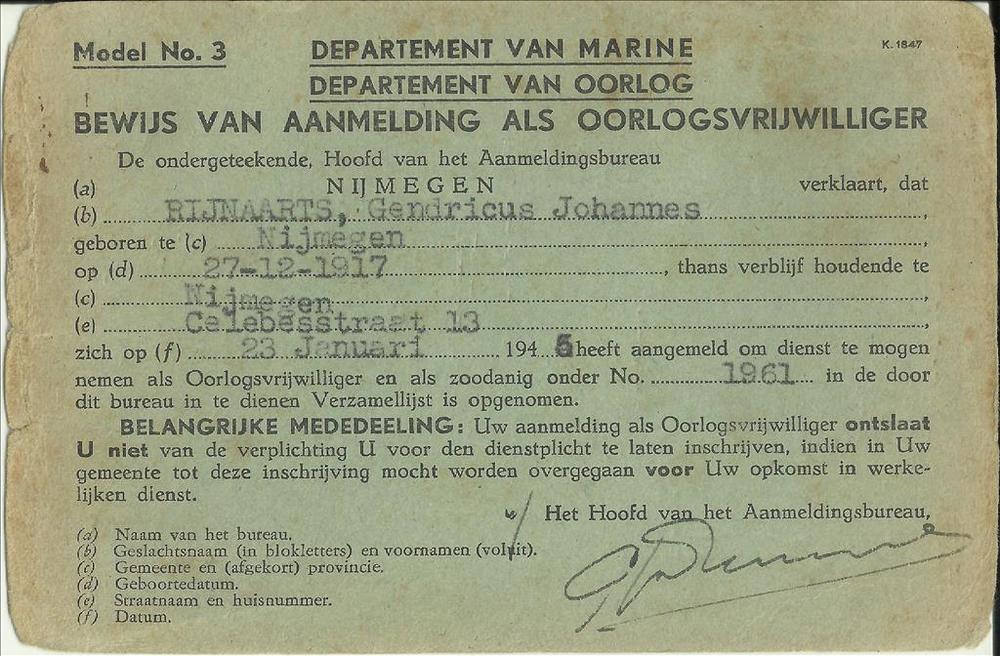 Bewijs van aanmelding als oorlogsvrijwilliger van G....