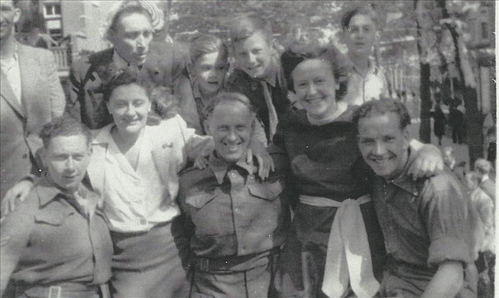 Foto's van tien militairen en twee meisjes en een fo...