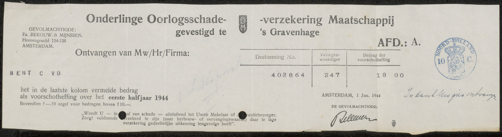 Kwitantie Onderlinge Oorlogsschade Verzekering Maats...