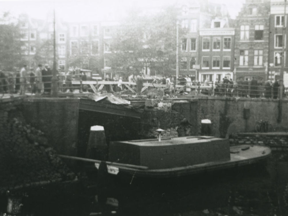 Foto van door bominslag beschadigde brug in Amsterda...