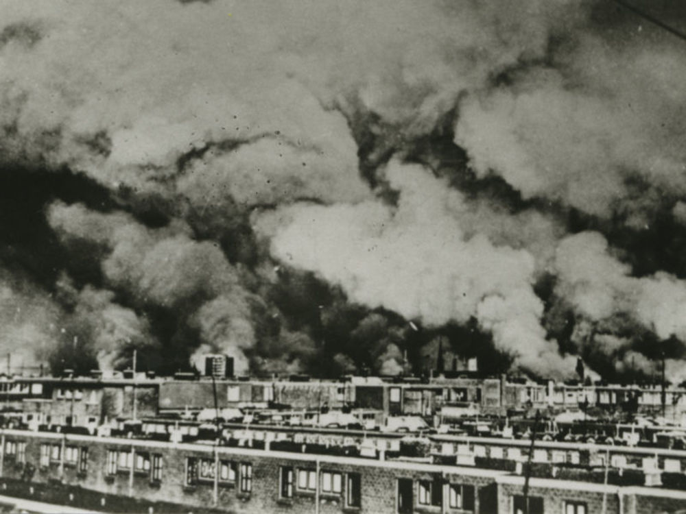 Foto brandend Rotterdam na bombardement van 14 mei 1...