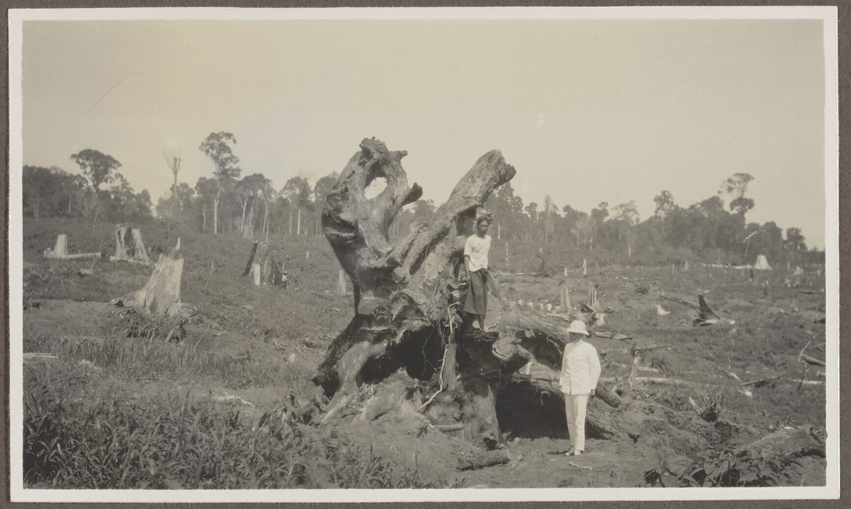 Omgehaalde boomstronk op ontgonnen terrein van de ru...