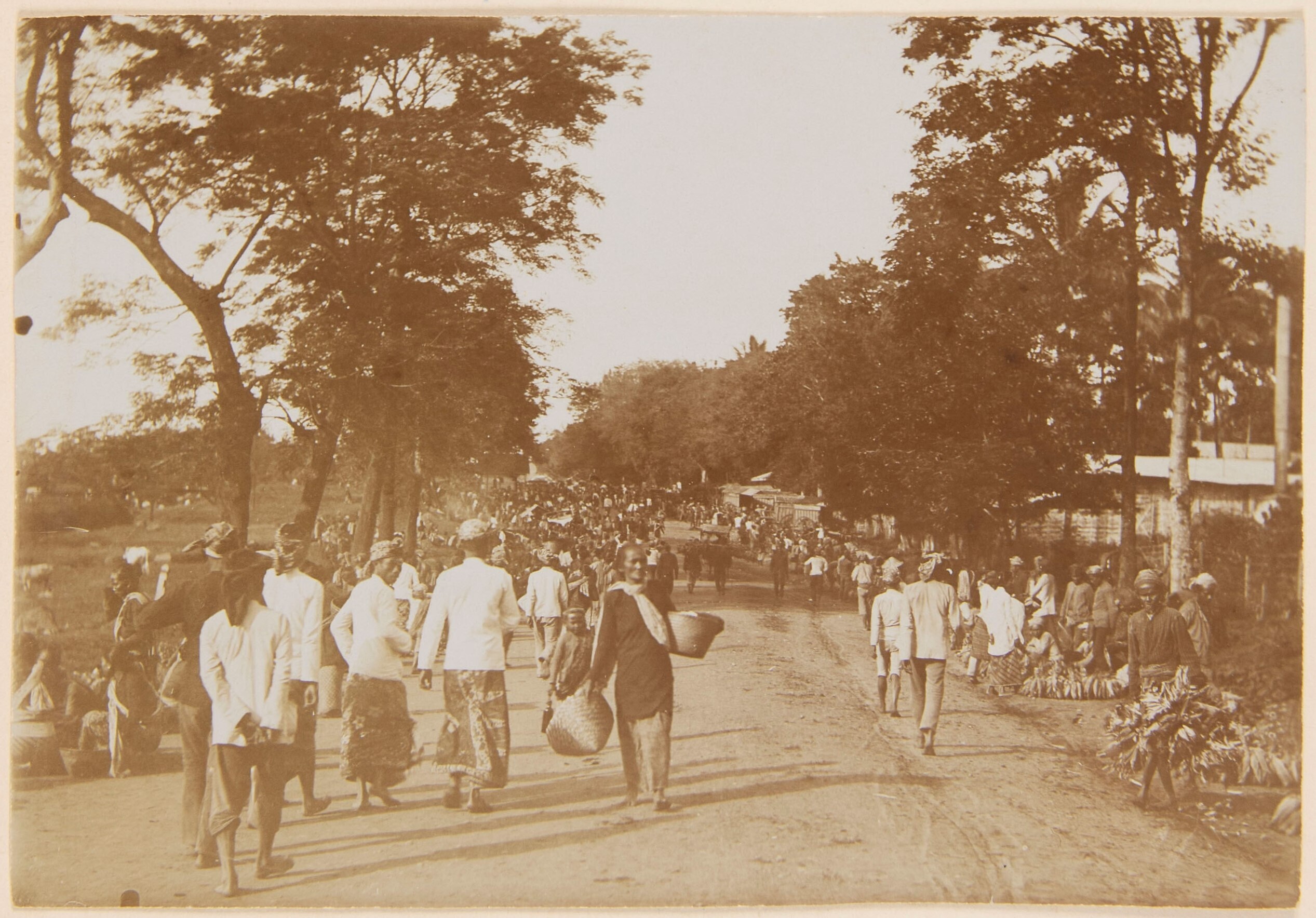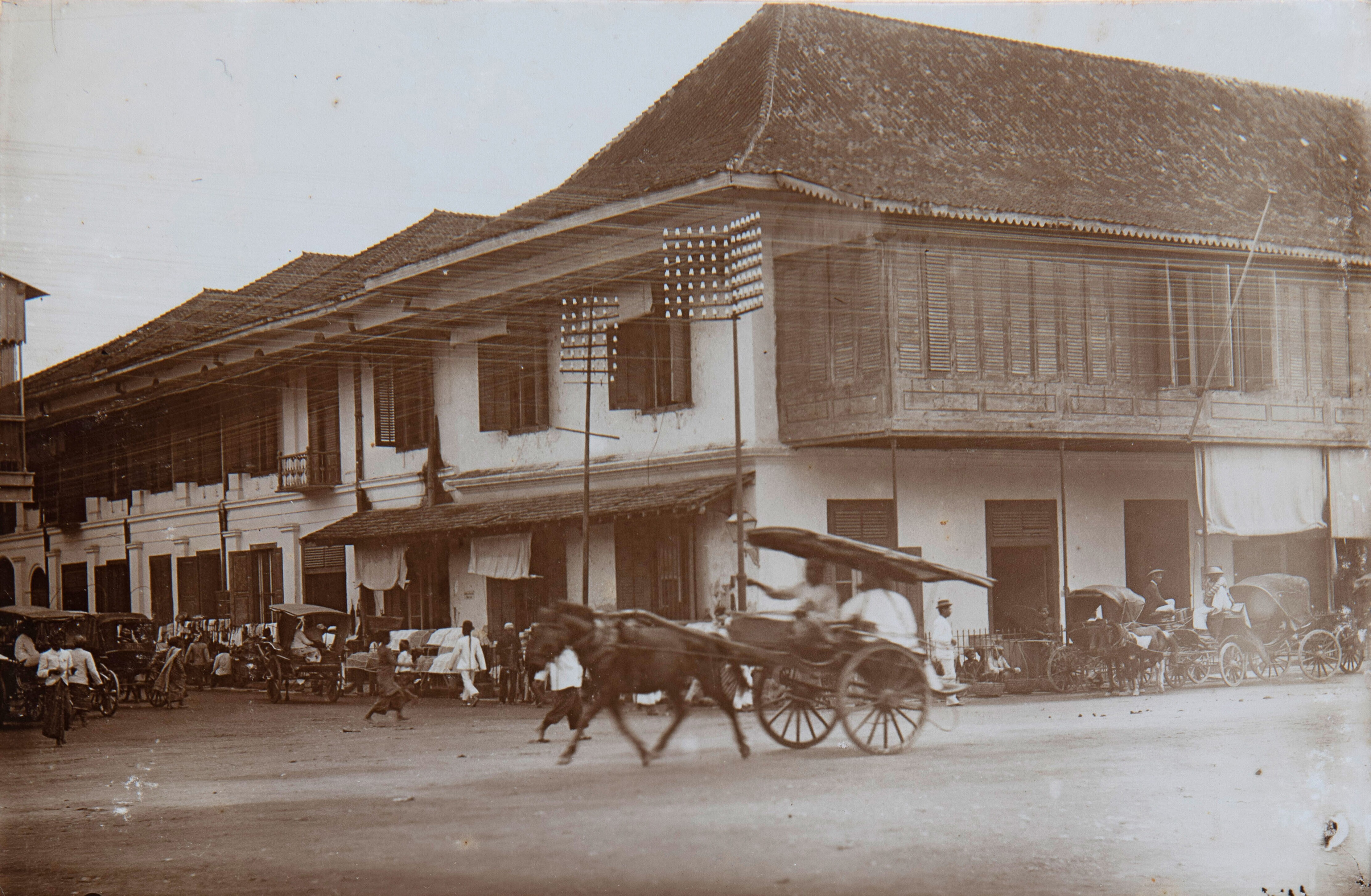 Street view with carriages and a market