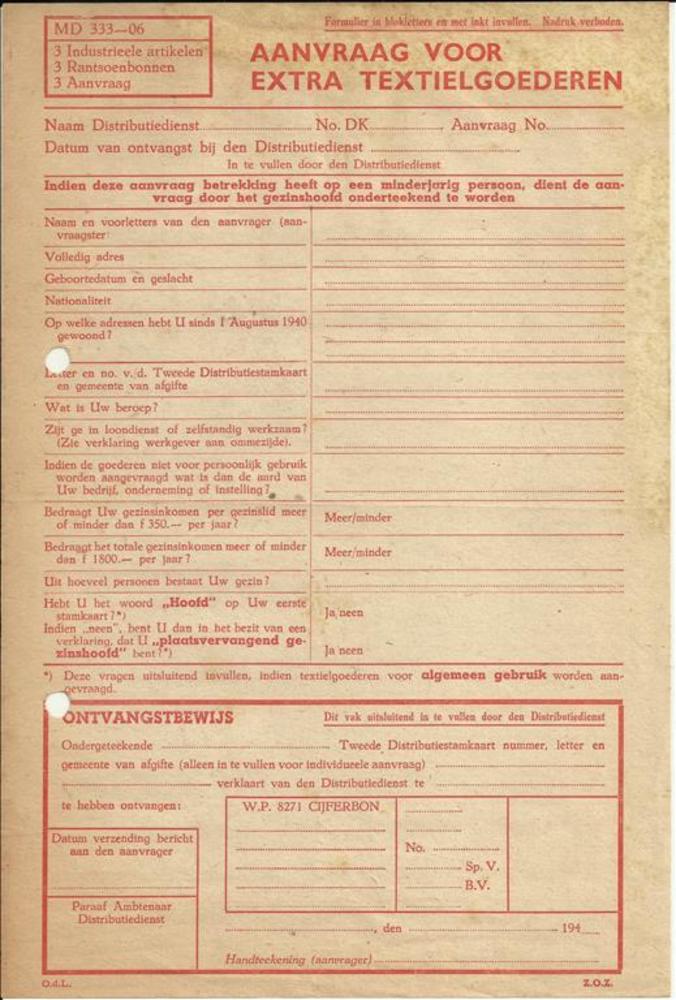 formulier, aanvraag voor extra textielgoederen MD 33...
