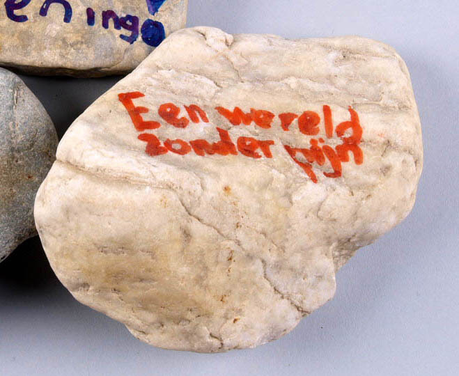 Een van drie stenen met teksten, "Vrede in wereld", ...