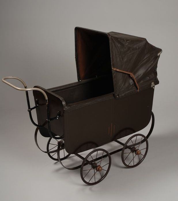 Zwarte poppenwagen met spaakwielen, diepe bak met huif