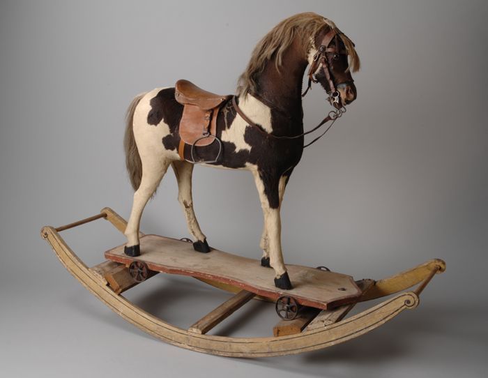 Hobbelpaard, zwart-wit gevlekt met zadel en tuig