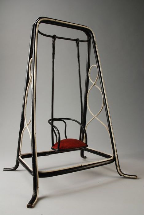 Poppenschommel van zwart en wit gebogen hout, staand...