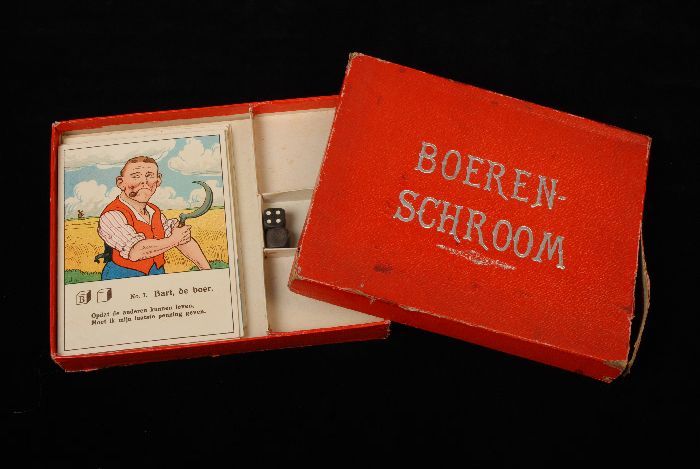 Spel "BOERENSCHROOM" in rode doos: acht kaarten, dob...