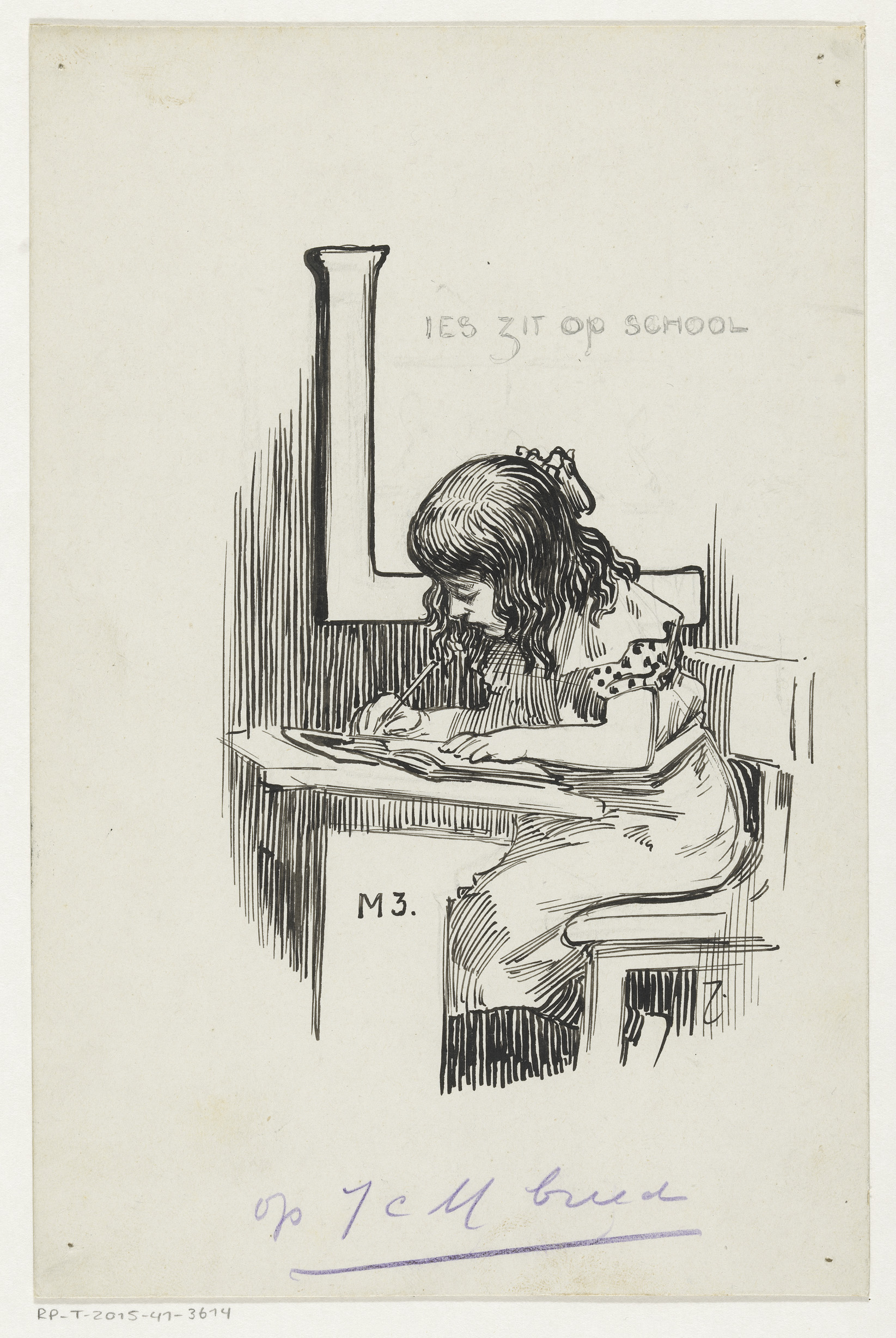 Schrijvend meisje in een schoolbank