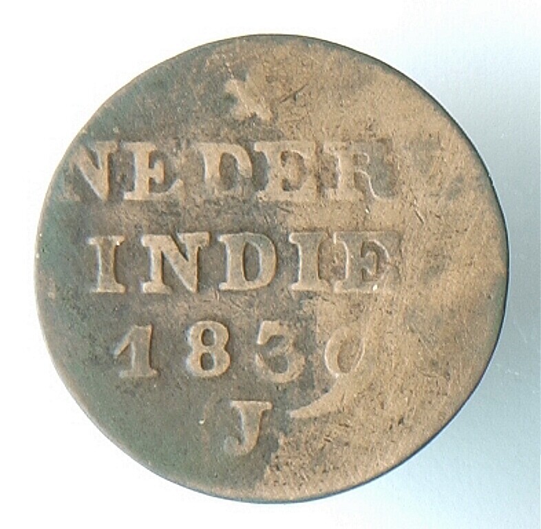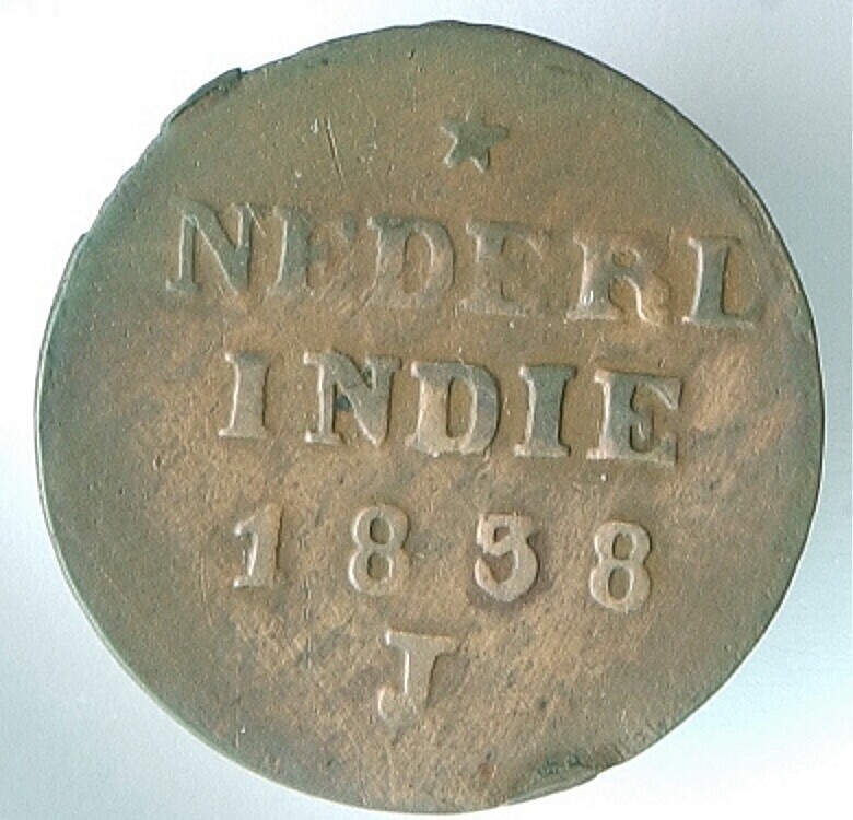 Koperen duit van de V.O.C. met het wapen van Holland