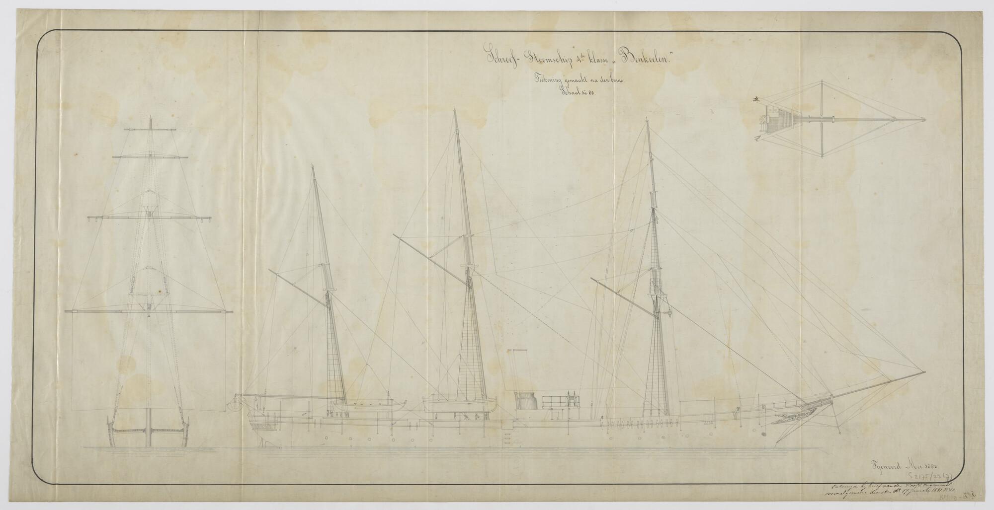 Lijnentekening met spantenraam en overzicht van de v...