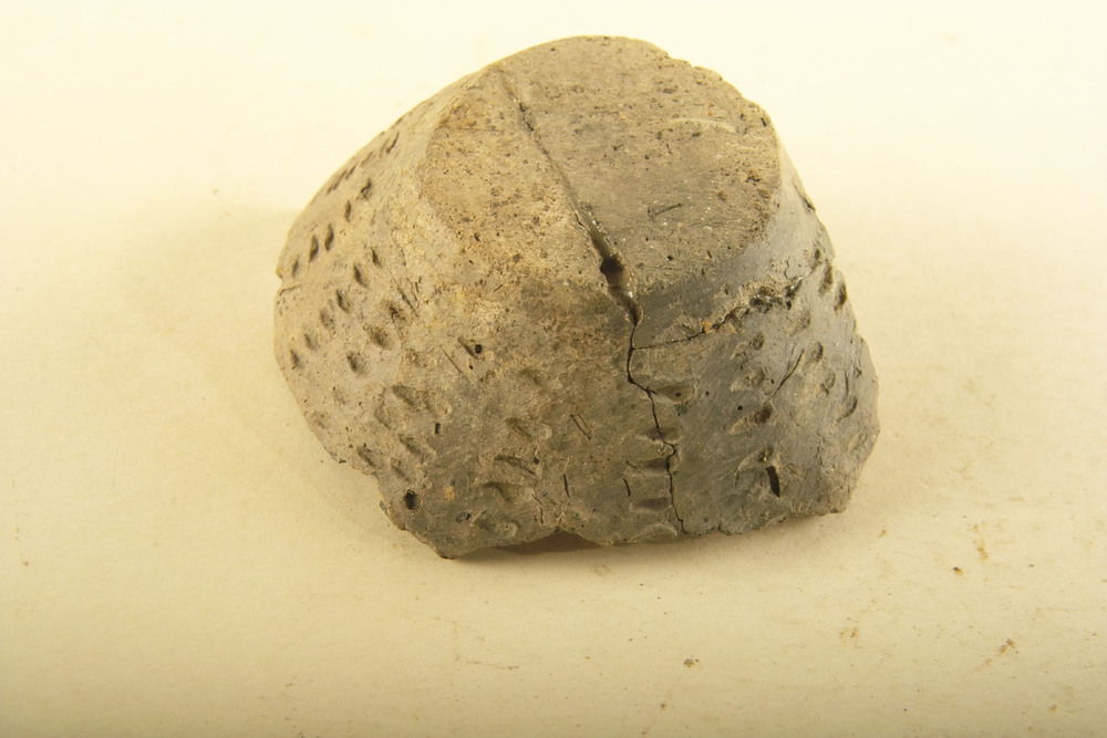 Bodemscherf van handgevormd aardewerk met versiering