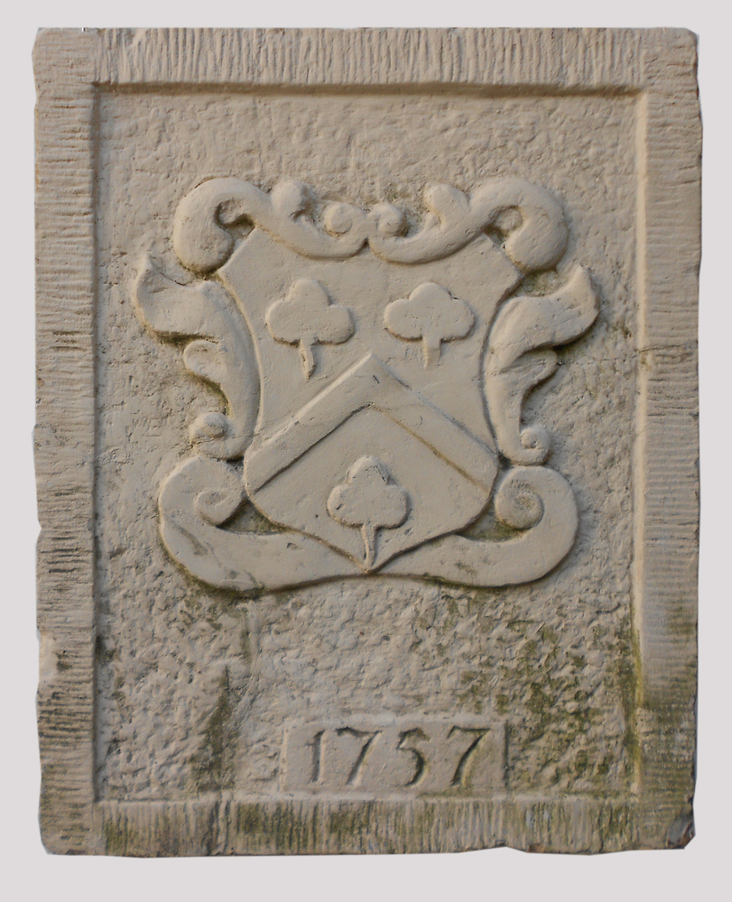 Haardsteen met daarop twee leeuwen en een wapenschild