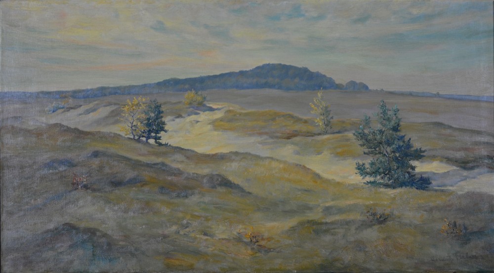 Zandverstuiving/morgenlicht over heidelandschap ( St...