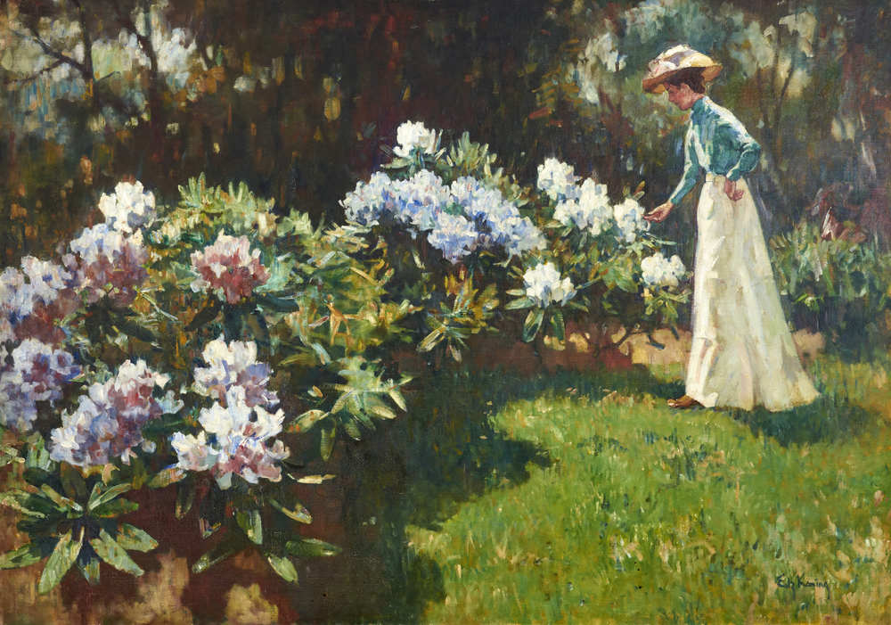 Jonge vrouw met hoed in tuin met bloeiende rododendr...