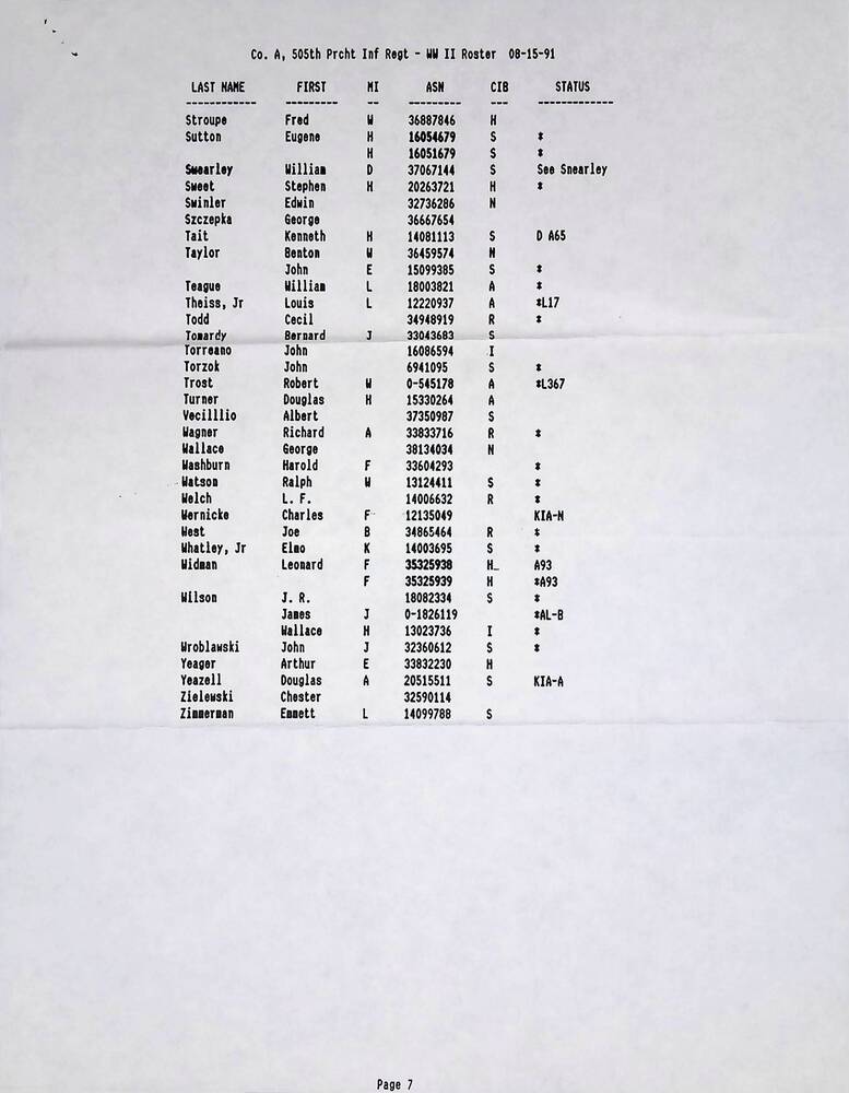 Co. A, 505th Prcht Inf Regt WW II roster 08-15-91