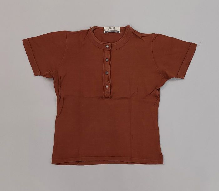 Kraagloos poloshirt van bruin tricot katoen, halsspl...