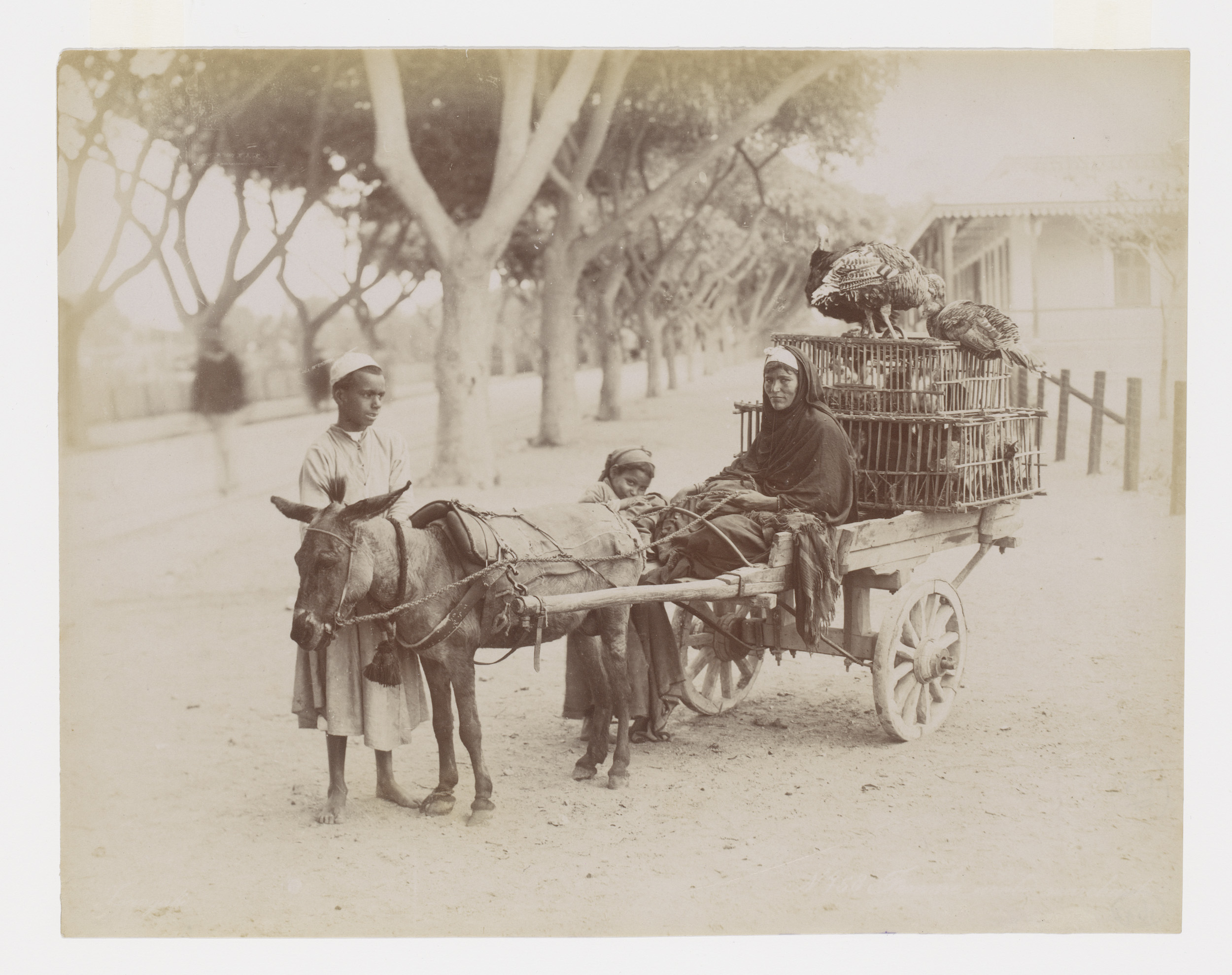 Vrouw met twee kinderen bij een met ezel bespannen k...