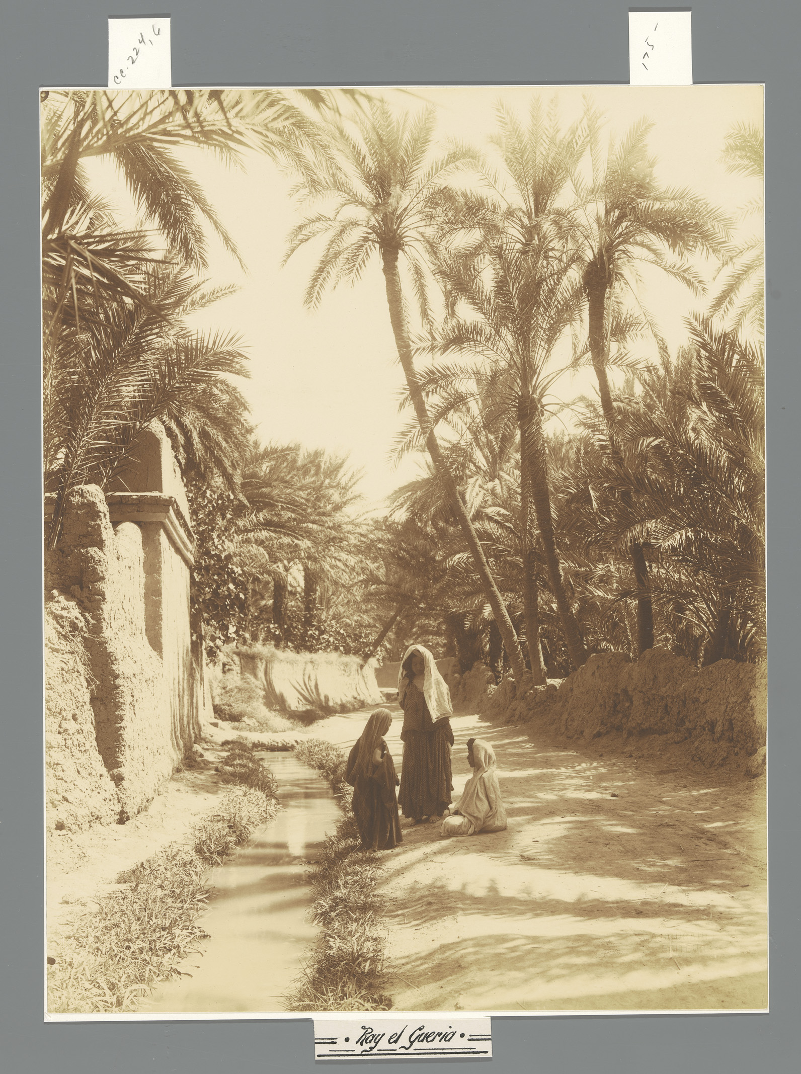 Drie kinderen bij een beek, mogelijk in Noord-Afrika