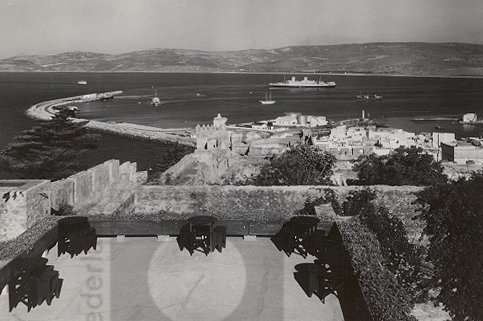 Stadsgezicht met batterij kanonnen, Tanger, Marokko ...