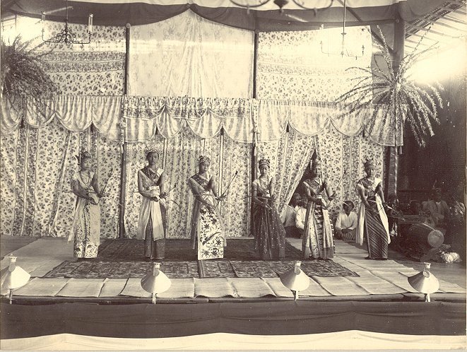 Zes Javaanse danseressen met pijl en boog in de hand...