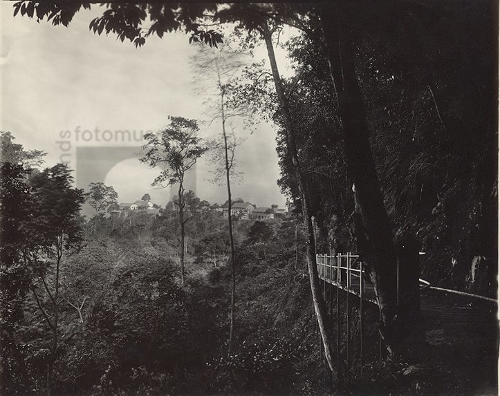 Bomenlaan met op de achtergrond een bergsawah, mogel...