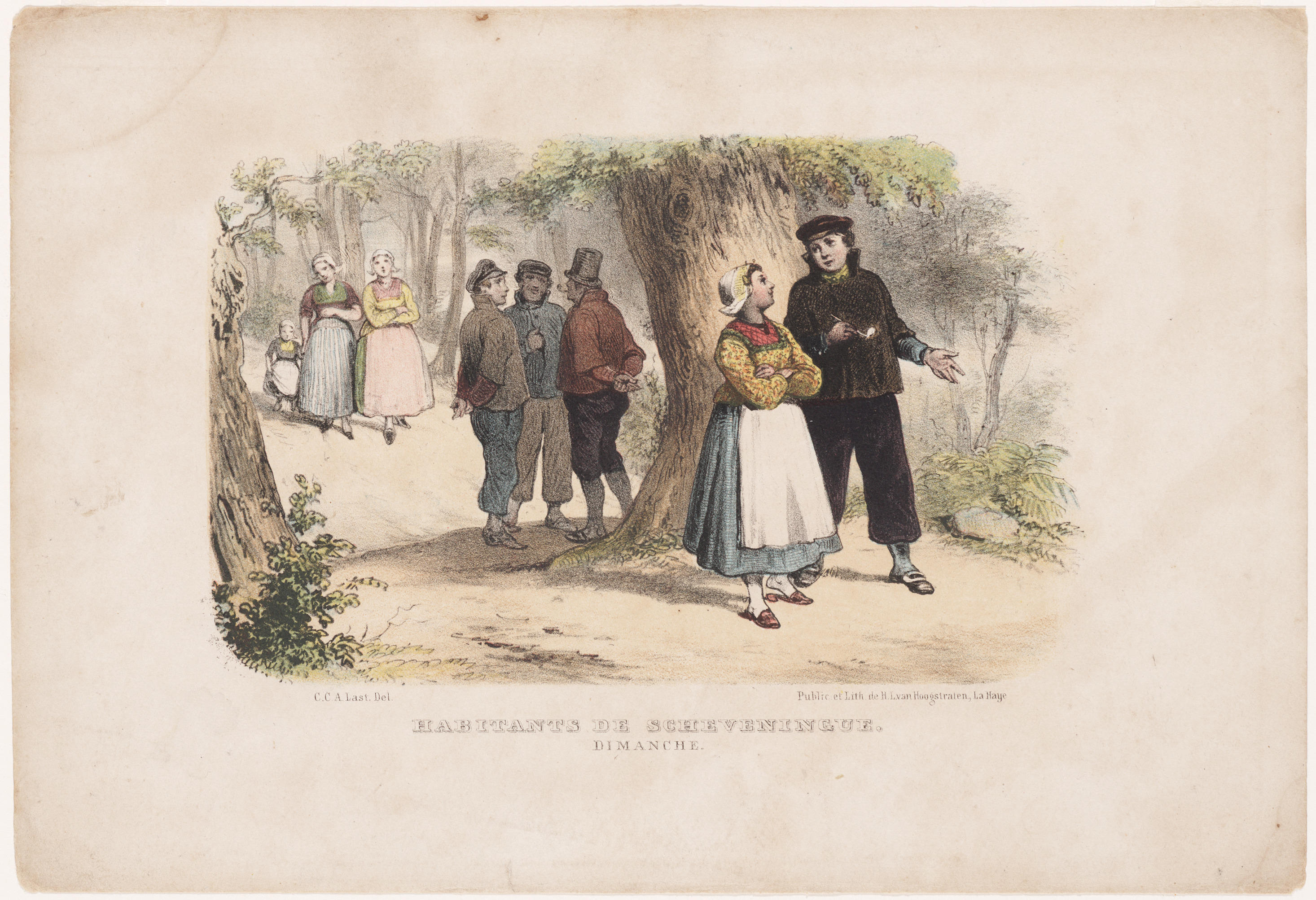 Scheveningse mannen en vrouwen op zondag, circa 1850