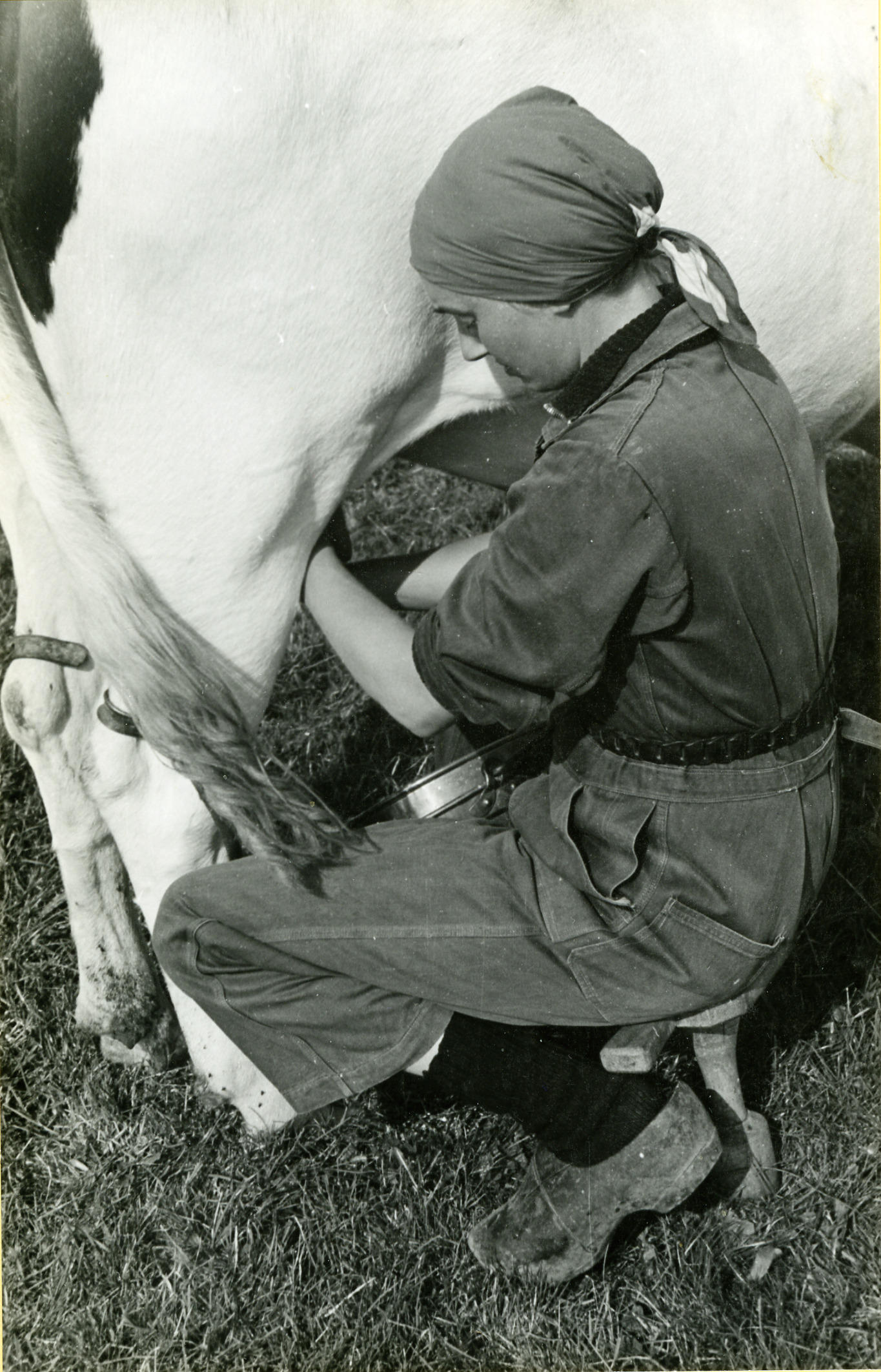 Melken met de hand, Molkwerum, 1944 (zwart-wit foto)