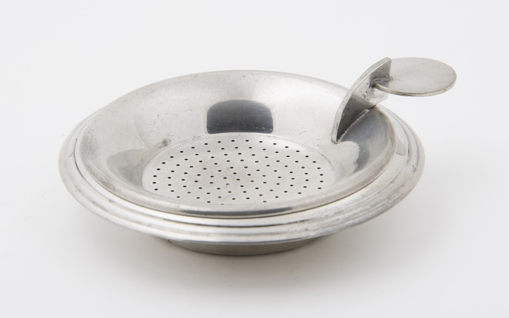 Theezeef met lekbakje van nieuw tin, vervaardigd doo...