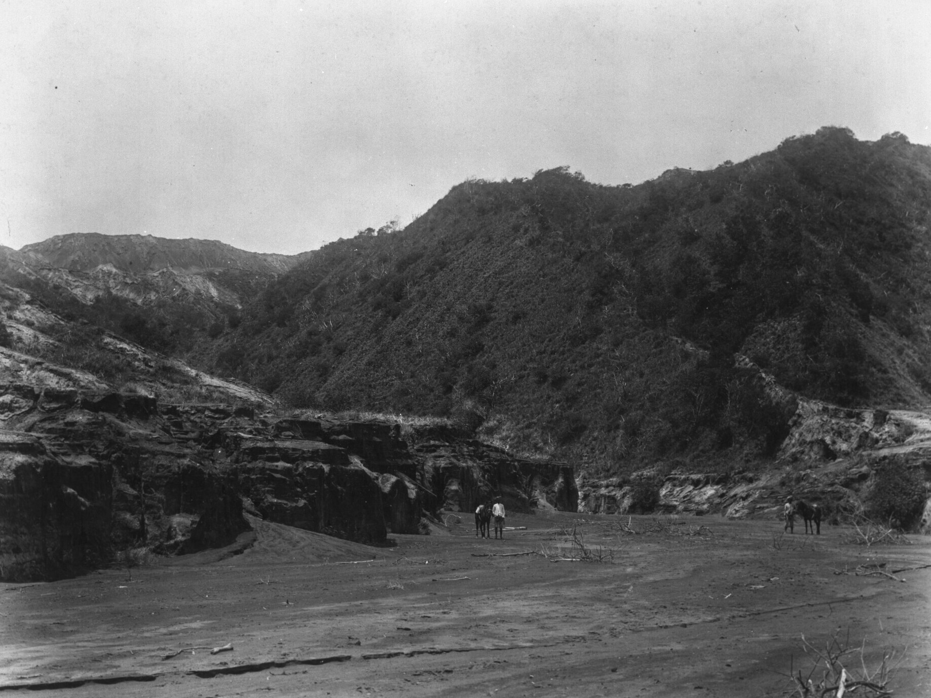 Gezicht op de Zandzee met rookpluim van een vulkaan